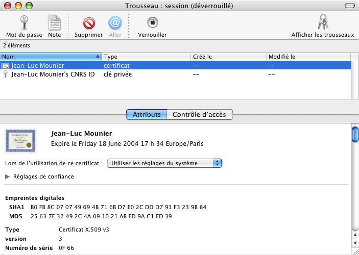 Sur MacOS X, il existe un certain nombre d'Autorités de Certification pré-enregistrées. Le CNRS ne fait pas encore partie de celles-ci, il faut donc le rajouter. Cela doit se faire une seule fois sous le compte d'administrateur (et même en root).