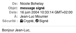 | Envoie d'un message signé (ou pas) (cocher ou décocher l'icône au dessus du texte du message) | Réception d'un message signé |