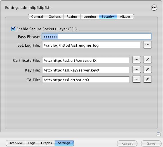 Entrer une Pass Phrase (mais elle n'est pas demandée plus tard ?) et vous devez éditer les trois fichiers (Certificate File, ket File et CA File). Or vous n'avez reçu que deux fichiers. Heureusement que le support CNRS vous indique la page extrèmement complète http://www.dr15.cnrs.fr/Delegation/STI/Certifs/Apache/, vous trouverez comment constituer le dernier fichier.