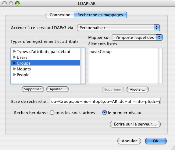 Nous choisissons une configuration RFC 2307 (Unix) dont nous allons légèrement modifier le mappage. Voir en annexe le mappage unix proposé sur MacOS X.