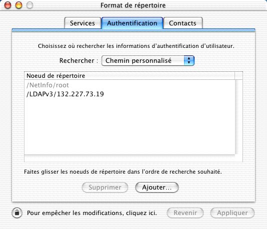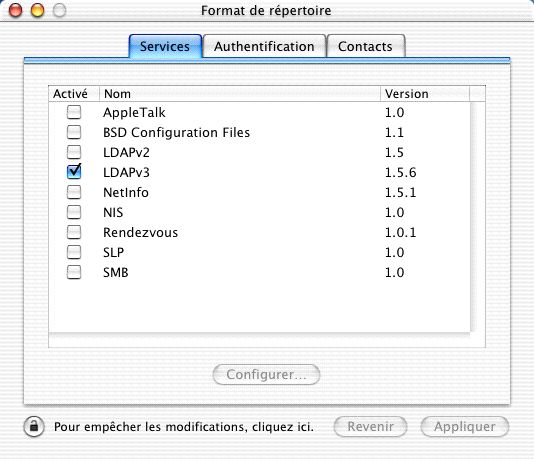 Cependant, cette configuration ne fonctionnera que si le client et le serveur MacOS X se trouvent dans le même sous-réseau et qu'il n'y a pas un autre serveur DHCP sur le réseau. Dans ce cas, il faudra indiquer l'adresse du serveur LDAP dans chaque client avec l'utilitaire Format de répertoire (Directory Access).