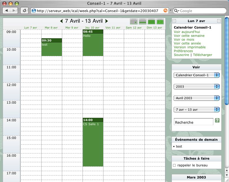 Sur une autre machine ou un autre compte, il est possible de s'inscrire au calendrier à l'adresse <webcal://serveur_web/ical/calendars/Conseil-1.ics>.